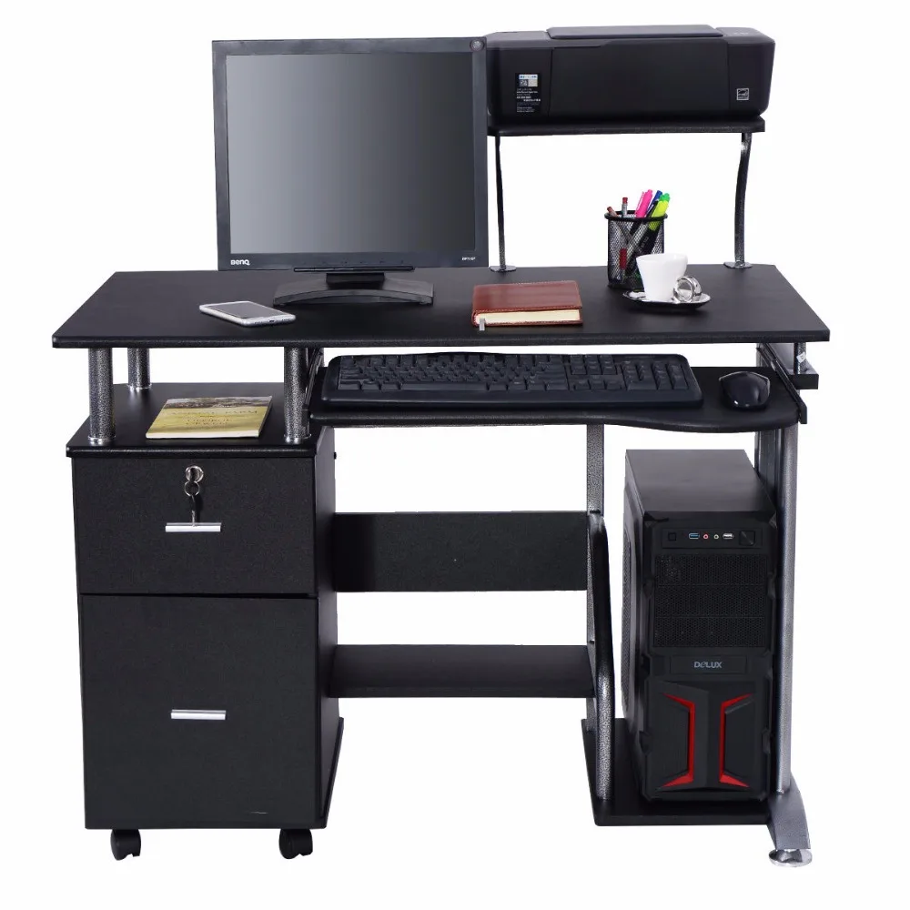 Black Wood Small Laptop Cart Desk With Drawers And Printer Shelf